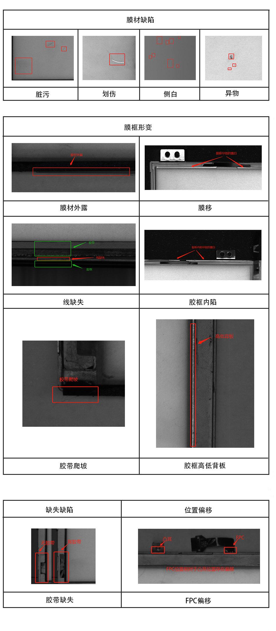 The appearance defects of the backlight module include: dirt, scratches, white sides, foreign objects, exposed film materials, film displacement, missing wires, tape climbing, concave frame, high and low backboards of the frame, missing tape, FPC offset, etc; The AOI inspection machine for appearance defects of backlight modules is used to replace manual visual inspection and achieve machine replacement.