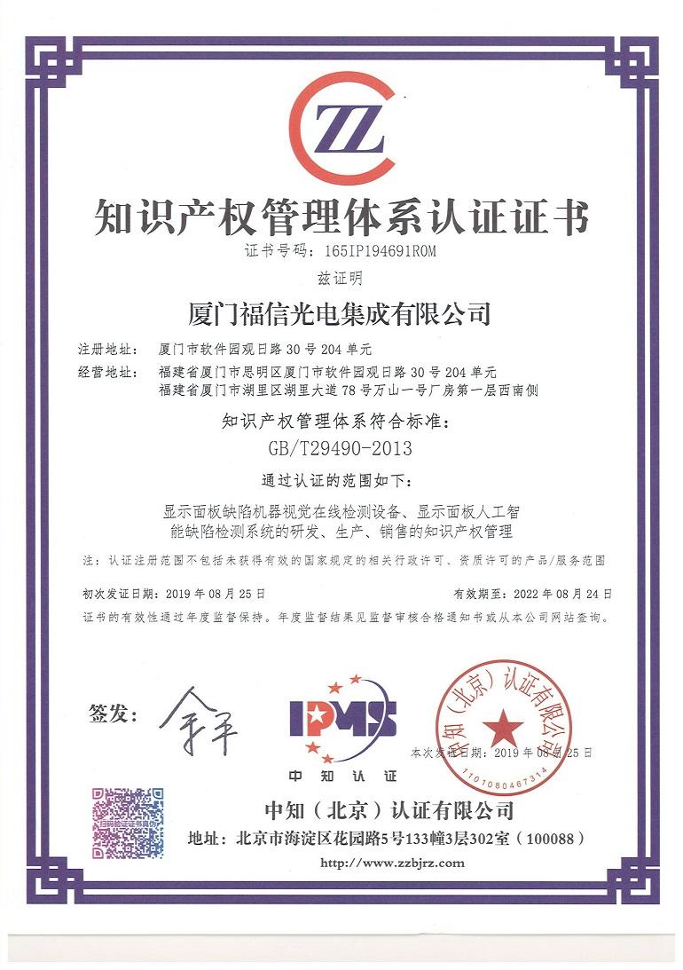 On August 25, 2019, our company successfully passed the system certification of GB/T 29490-2013 Code for Enterprise Intellectual Property Management through early active preparation, and obtained the certification of "display panel defect machine vision online detection equipment, display panel artificial intelligence defect detection system research, development, production and sales of intellectual property management".