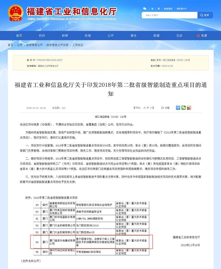 In recent years, Fujian Province has vigorously promoted the development of intelligent manufacturing, promoted industrial transformation and upgrading, and promoted the application of the new model of intelligent manufacturing. A batch of enterprises with outstanding intelligence level in products, production processes, management, services and other fields have emerged all over the country. Among the projects recommended by various places, Fujian Provincial Department of Industry and Information Technology organized, prepared and issued the Notice on the Second Batch of Key Projects of Provincial Intelligent Manufacturing in 2018. Fuxin Optoelectronics "LCD micro scratch intelligent detection equipment based on artificial intelligence technologies such as image recognition and deep learning", as the first major technical equipment certification project of provincial intelligent manufacturing province, was successfully selected into the "Second Batch of Key Projects of Provincial Intelligent Manufacturing in 2018", which is the affirmation of relevant government departments for Fuxin Optoelectronics' achievements in innovation and upgrading over the years, and also provides strong support for the company's future comprehensive development.